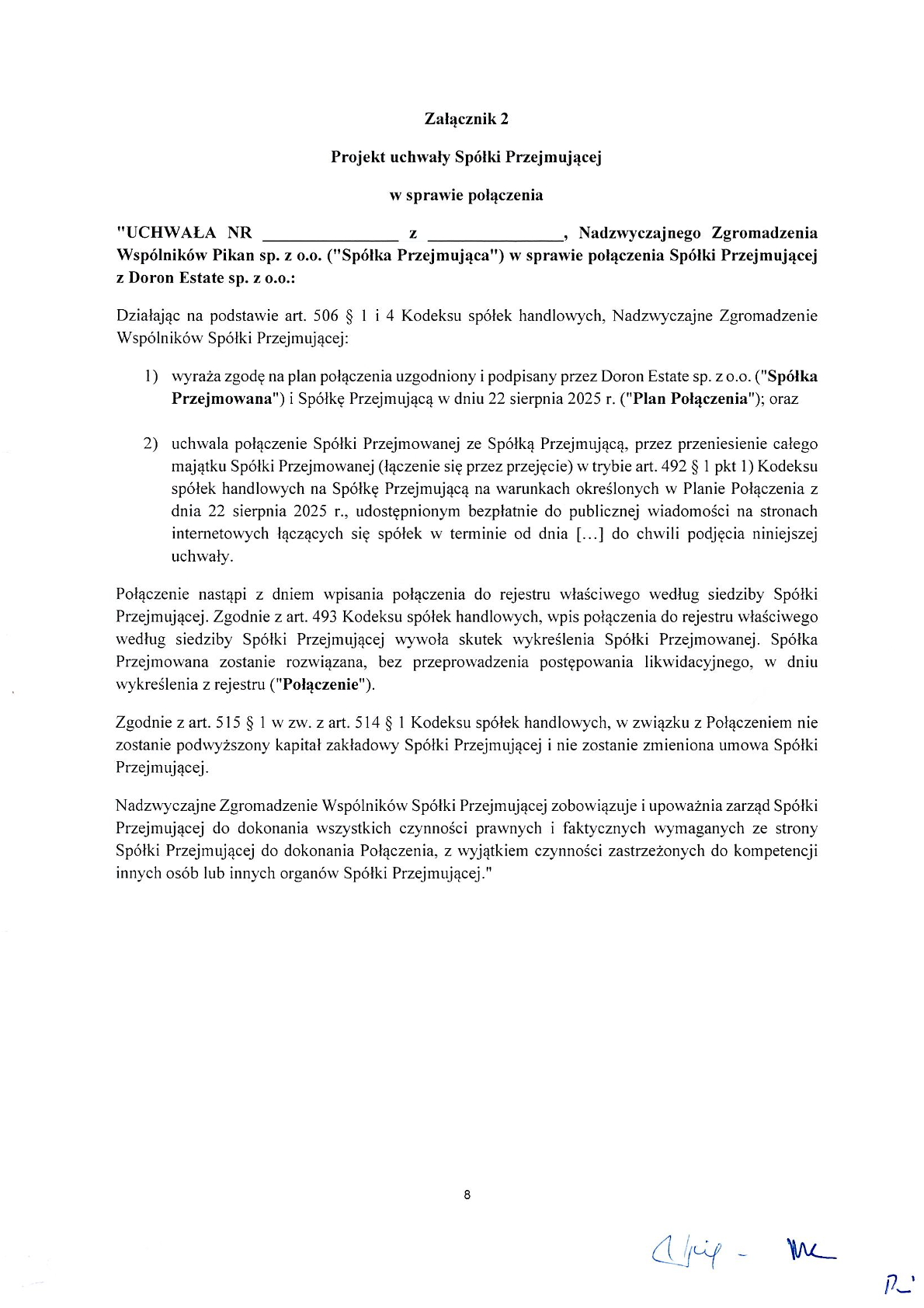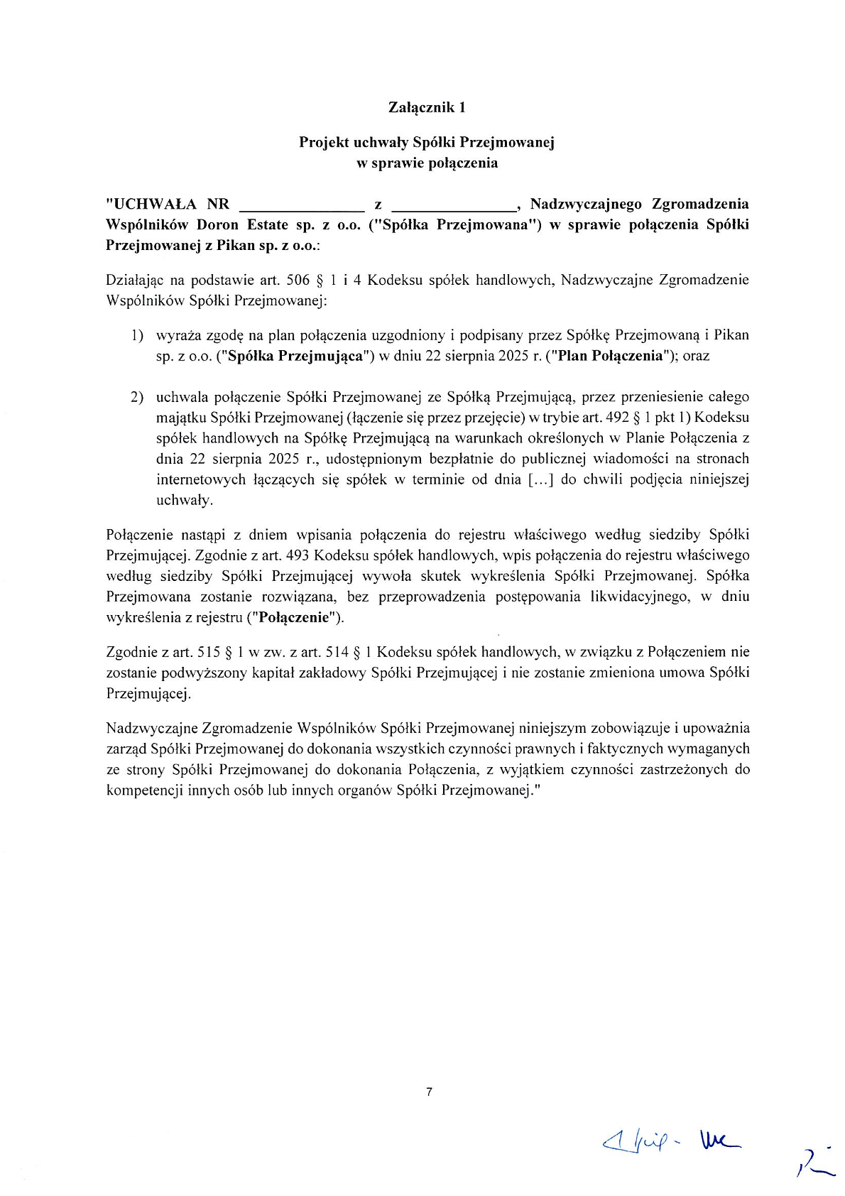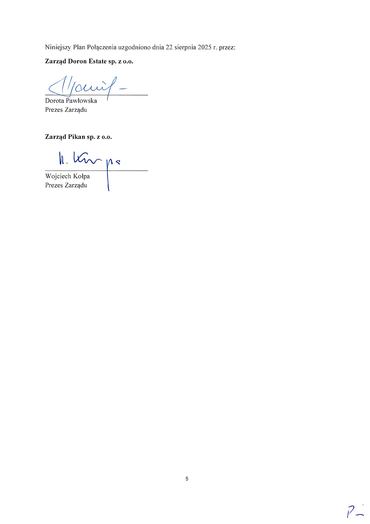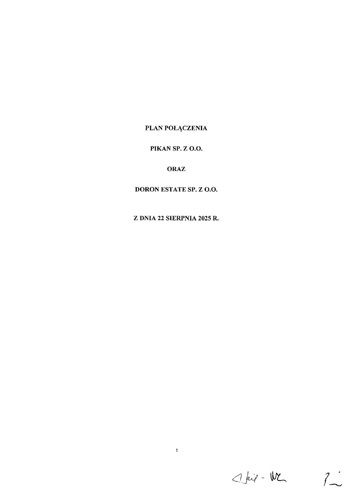 Plan połączenia PIKAN SP. Z O.O. oraz DORON ESTATE SP. Z O.O. z dnia 22 sierpnia 2025 r. - w formacie PDF